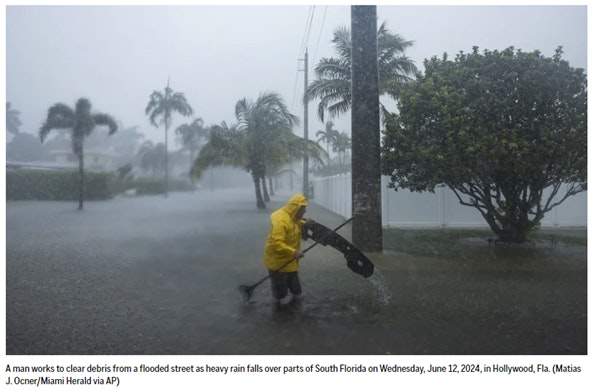 (4) Frisaro, F., Spencer, T., & Kozin, D. (2024, June 14). Tropical rainstorms in South Florida lead to flight delays and streets jammed with stalled cars. AP News. https://apnews.com/article/tropical-rainstorms-south-florida-flooding-2024